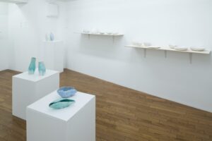 川村今日子は女子美術大学の造形学専攻を卒業後、更に技術を学ぶためイギリスに渡り、現在もイギリスで制作をしています。研究を重ねている結晶釉は、焼成の間に釉薬が結晶となって開き、表面に花や雪の結晶のような模様が出来るのが特徴です。白を基調としたシンプルで華やかな磁器による花器や食器を展示致します。