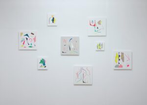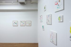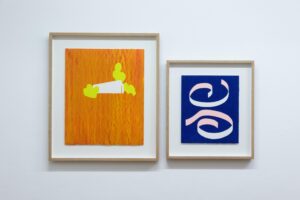 また、今回は木版の作品に加え、コラージュの作品を制作しました。コラージュ作品は、彩色した紙を無造作に切り抜き、紙の上に貼付けています。切り抜いた「かたち」と、切り残された「かたち」が混在し、イメージを作ります。木版の制作に使用する様々なかたちの型紙にも似て、木版画作品の兄弟、「かたち」を表す別の方法と思い制作しました。