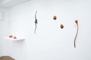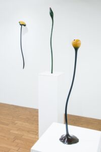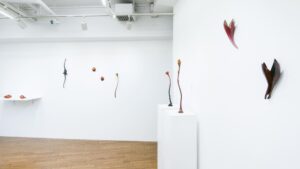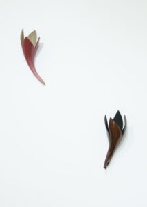 今回の作品は、花が咲く、実が生る、芽が伸びるといった木々や草花が刻々と姿を変えていく動きを、形や色や光の加減で多彩に変化する塗膜で表しました。力強さや移ろう儚さを形に留めて、花器に花を活けて楽しむように空間へ瑞々しく拡がっていき装飾します。