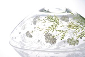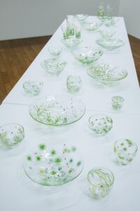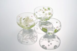 西山雪は北海道に生まれ、富山ガラス造形研究所、高橋禎彦グラススタジオアシスタント、モニカ・L・エドモンドソン アシスタント(スウェーデン)等を経て、2010年から北海道を拠点に制作しています。作品の柔らかく澄みきったガラスの色合い、シンプルで緊張感のあるフォルム、表面に施された小さな景色。それらは作家が日々目にする大自然の営みから受けた感動がもとになっています。吹きガラスから生まれるやわらかな曲線に、彫りと筆で絵付けを施した器、ぐいのみ・片口・小鉢・鉢・水差し・花器等、初夏の花々や昆虫、魚が遊ぶうつわ約100点、オブジェも展示致します。ぜひご高覧下さい。