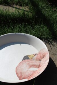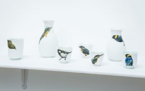 今回は『酒の宴』ということで、かつて酒豪と呼ばれた20代を思い出しつつ制作させていただきました。酒の楽しみの一つは会話だと思います。気心の知れた友人、そうでもない人、もちろん一人酒も。自分や他人、猫相手でも、お酒を飲めば会話が弾む気がするのです。そんな席に華、ならぬ鳥や動物をお供としてそっと(たまに「そっと」でないものも)器に描かせいただきました。記憶の中の鮮烈な生き物たち、まだ見ぬ憧れの鳥たち。その生物の美しさをできるだけ忠実に、とは思っておりますが、私の器に生きる彼らには、若干私の妄想が入っております。その境目を、夢うつつの酒の席にも楽しんでいただければ幸いです。