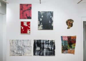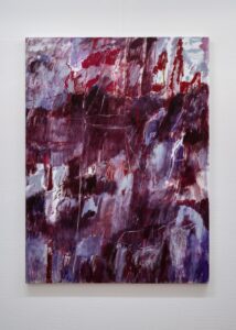 80年代後半に新表現主義(ニューペインティング)が到来し多大な影響を受け、より衝動的な作風になりました。この頃はキャンバスから離れベニヤや建築用テントに布のコラージュへと移行し、次第に具体的な要素が無くなり色や形で構成。パッチワークの様に布を繋ぎ増殖的要素が増えると平面性よりも立体的(レリーフ)要素(造形的な)が強くなってきたので元々は絵を描く事を主としていたのが平面から逸脱しだしたのでキャンバスに油彩で描くオーソドックスな技法に回帰しました。