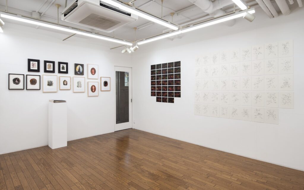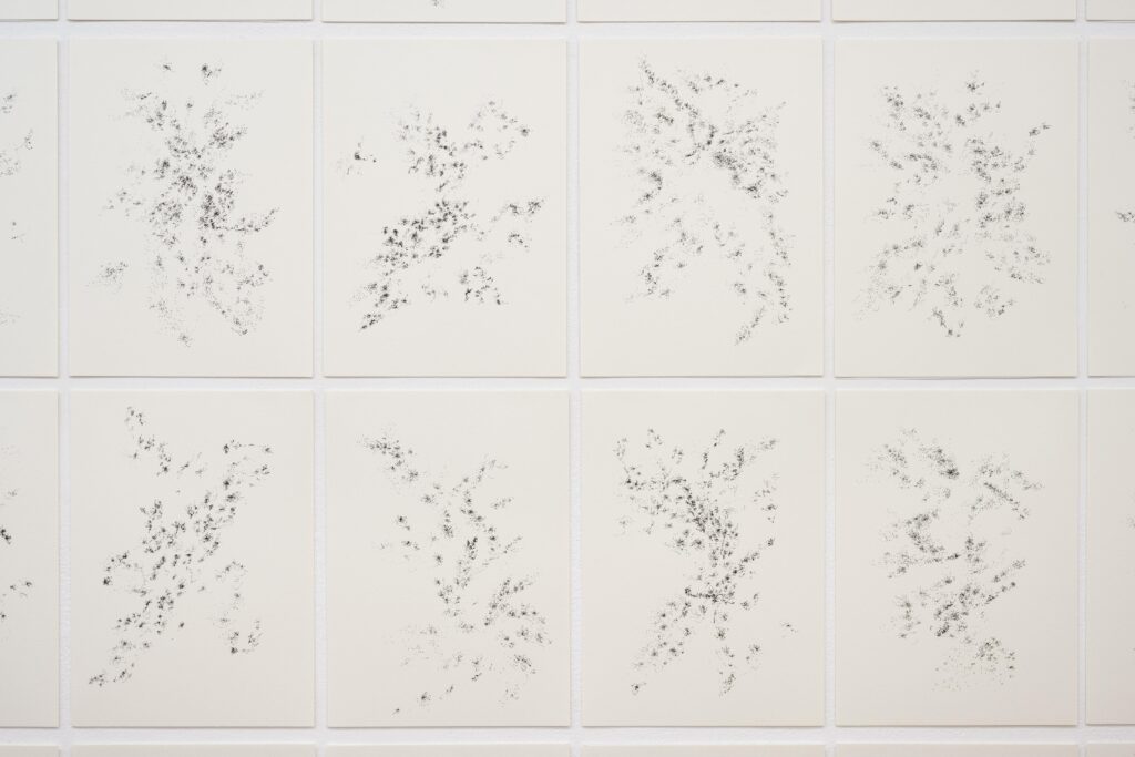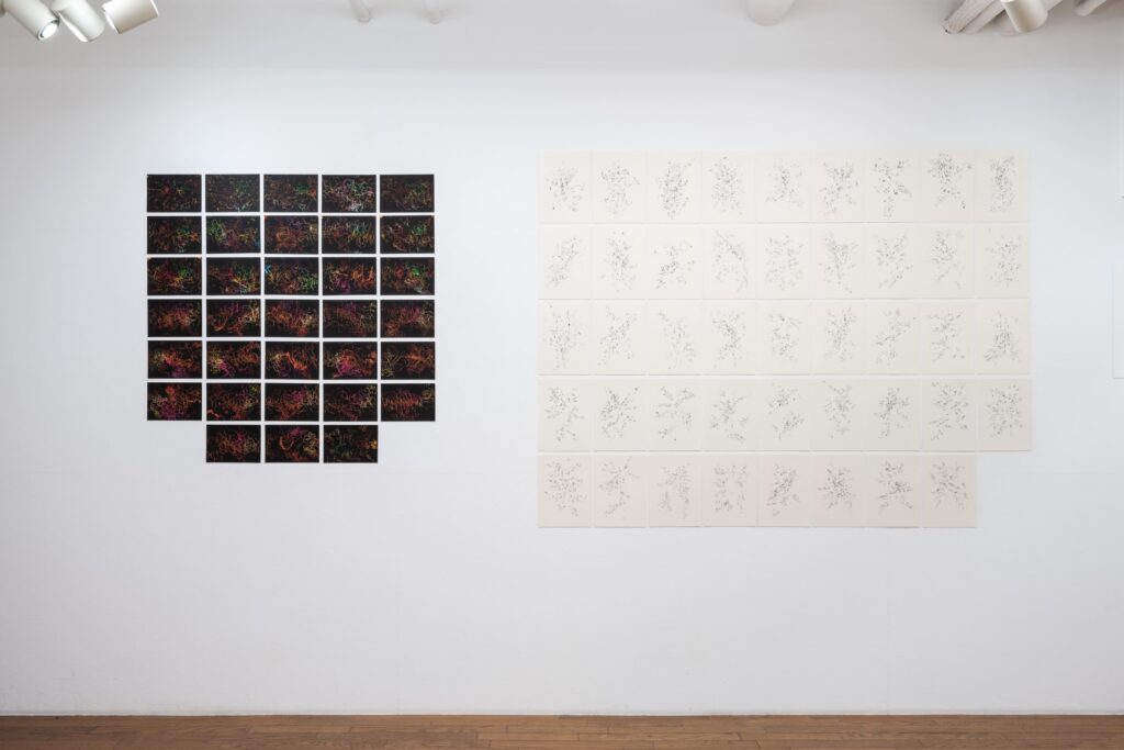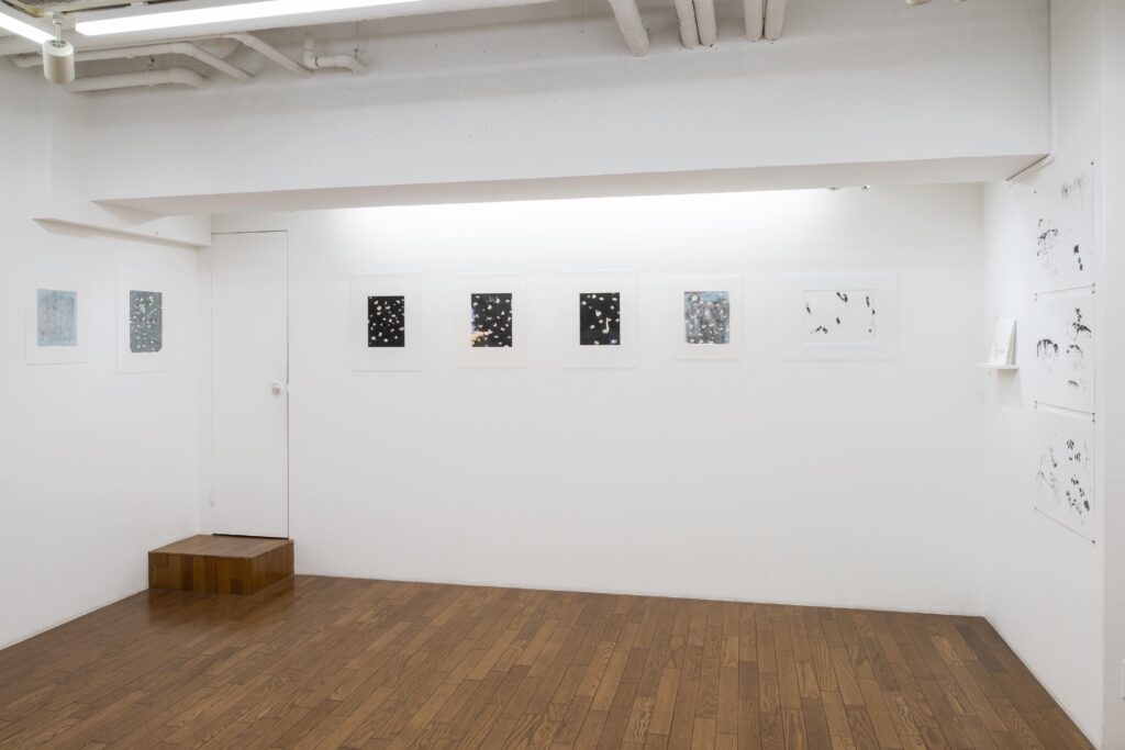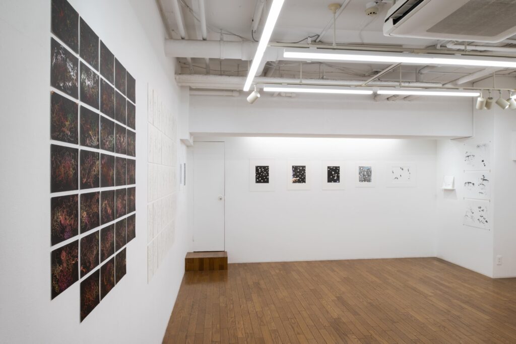 「盲目心拍図」は眼を閉じて自らの心拍に合わせて點を打ち続けると云う方法に拠るもので、元々は網膜視覚を媒介させずに描くことの実験として構想されたが、今回出品作は病床での自己観察の記録と云う側面が強い。器官統合體としての身體と心的状態が疾病と治療のなかで如何に変遷してゆくかを、内省にも外的(身體的)状況にも偏倚せず記録することを心掛けたものである。